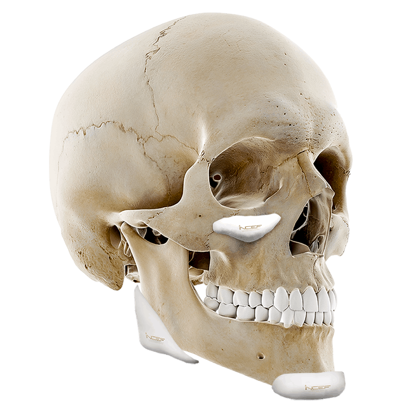 Uma prótese pré-fabricada de polietileno poroso de alta densidade, é selecionada de acordo com o tamanho da mandíbula do paciente e encaixada em justaposição sob anestesia local. Trata-se de um material de excelente qualidade que se adapta perfeitamente à mandíbula por causa da sua característica de alta porosidade, criando um formato harmônico e delineado para o rosto do paciente. É um material 100% biocompatível, ou seja, não causará nenhuma reação de corpo estranho.
